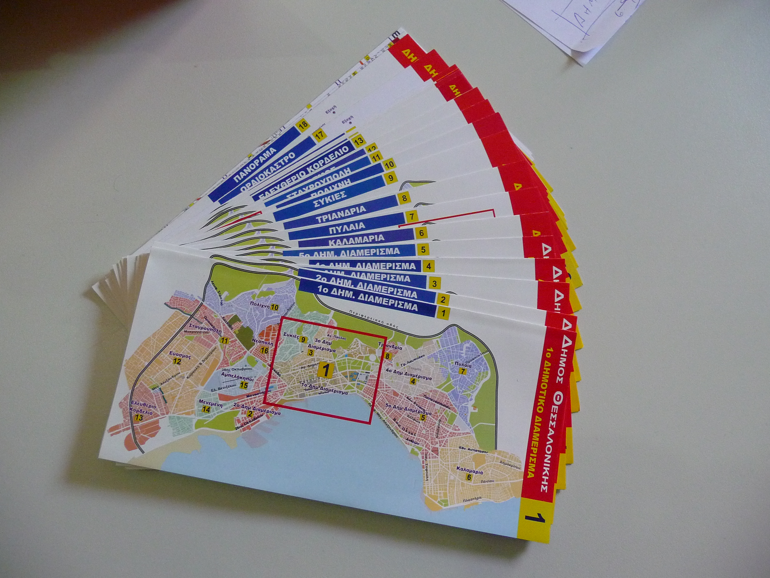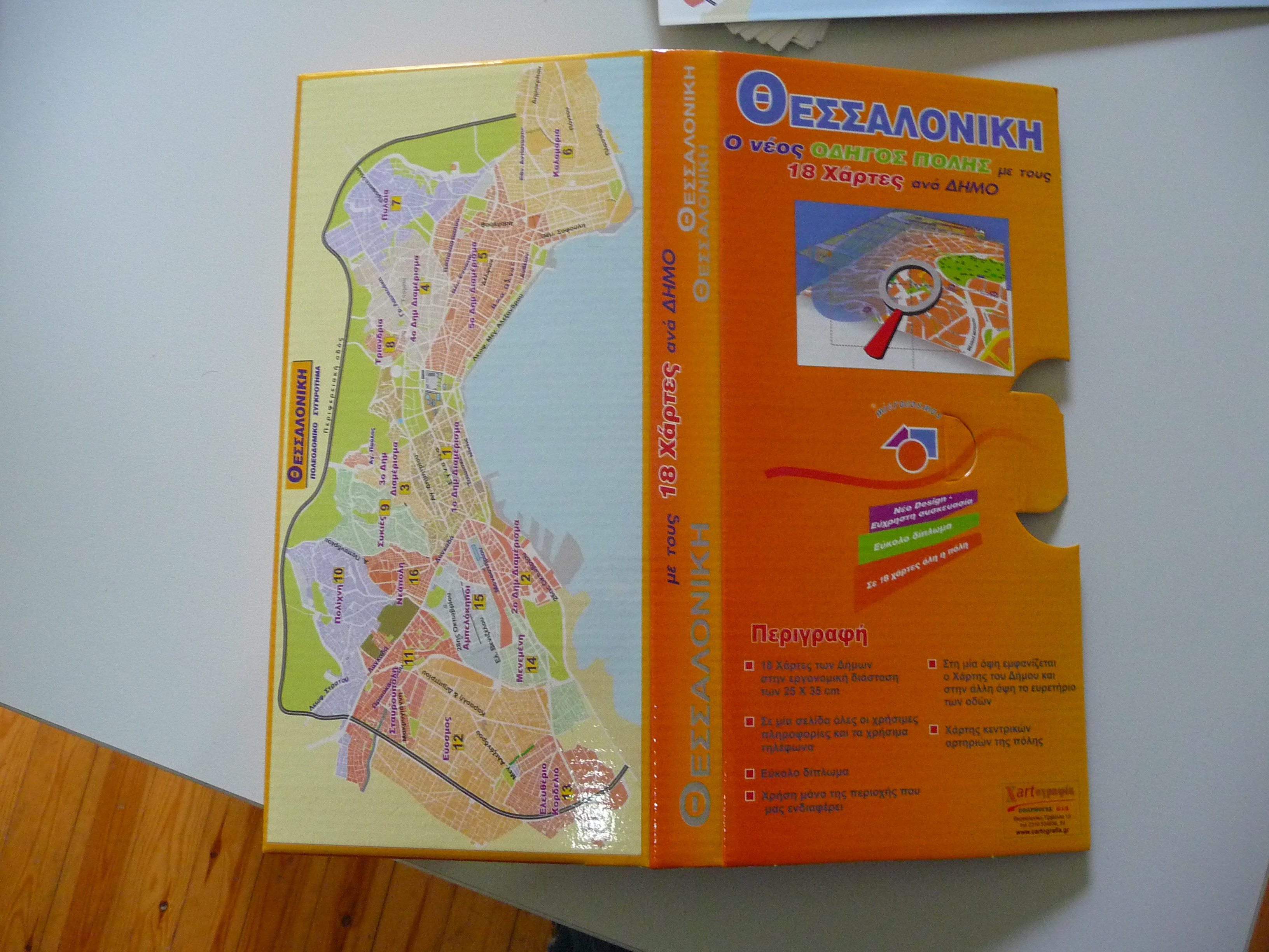 Ενα πρωτότυπο προϊόν που περιλαμβάνει τη Θεσσαλονίκη σε 15 Χάρτες ανά Δήμο(Καποδιοστριακό),με το ευρετήριο οδώ στη μία όψη και το χάρτη από την άλλη.