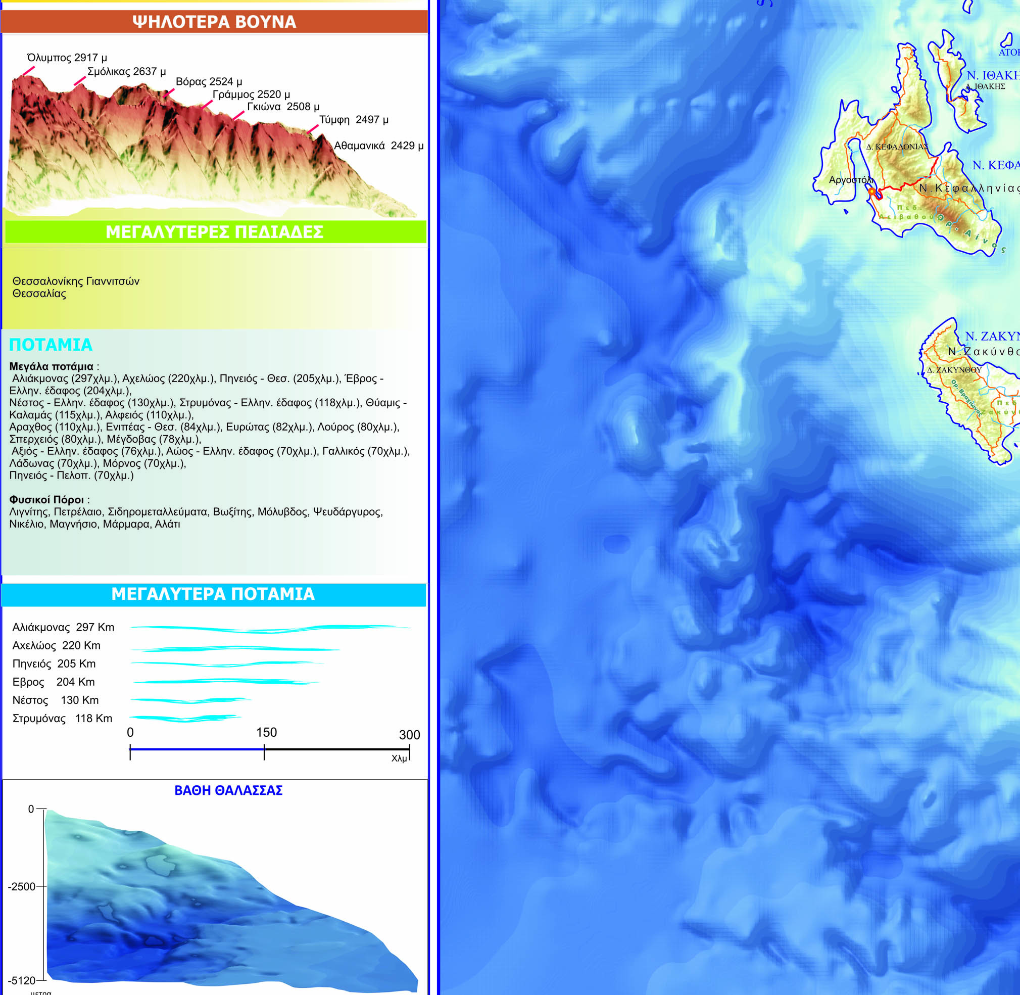 Ο νέος Γεωφυσικός χάρτης που περιλαμβάνει το ανάγλυφο της Ελλάδας με την πιο μοντέρνα απεικόνιση, είναι κατάλληλος για Σχολεία, Γραφεία κυνηγούς, ορειβατες κ.λπ. Περιέχει όλα το ανάγλυφο του Ελλαδικού χώρου με τα βουνά ονομαστικά αλλά και το ανάγλυφο του βυθού.Επίσης κείμενο με τα βασικά χαρακτηριστικά της γεωμορφολογίας της Ελλάδας.