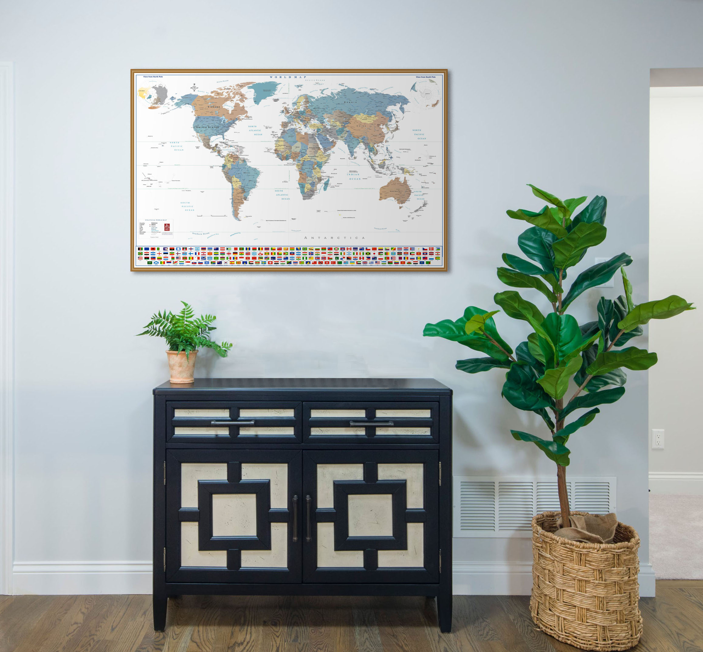 Ένας πρωτότυπος vintage παγκόσμιος χάρτης με ισχυρή διακοσμητική χροιά για χώρους με απαιτήσεις υψηλής αισθητικής.