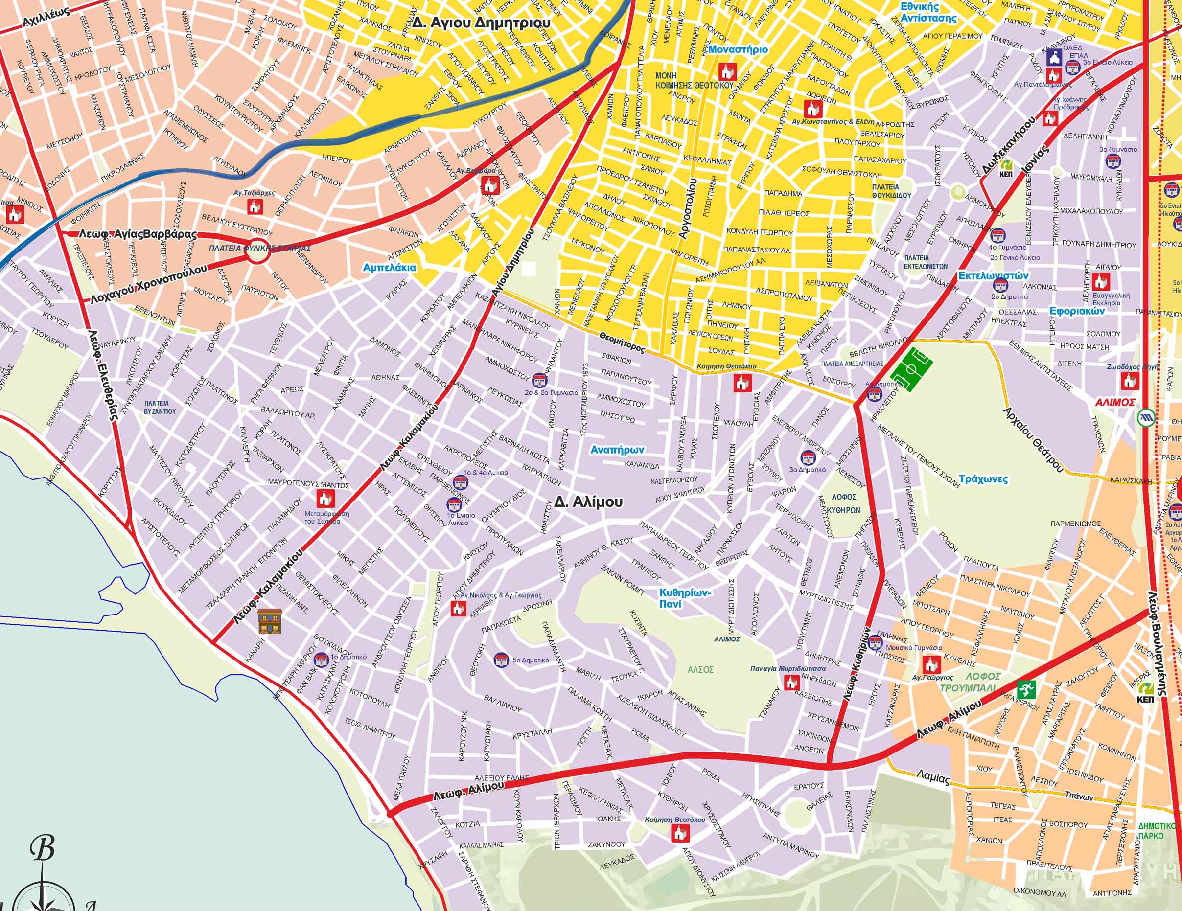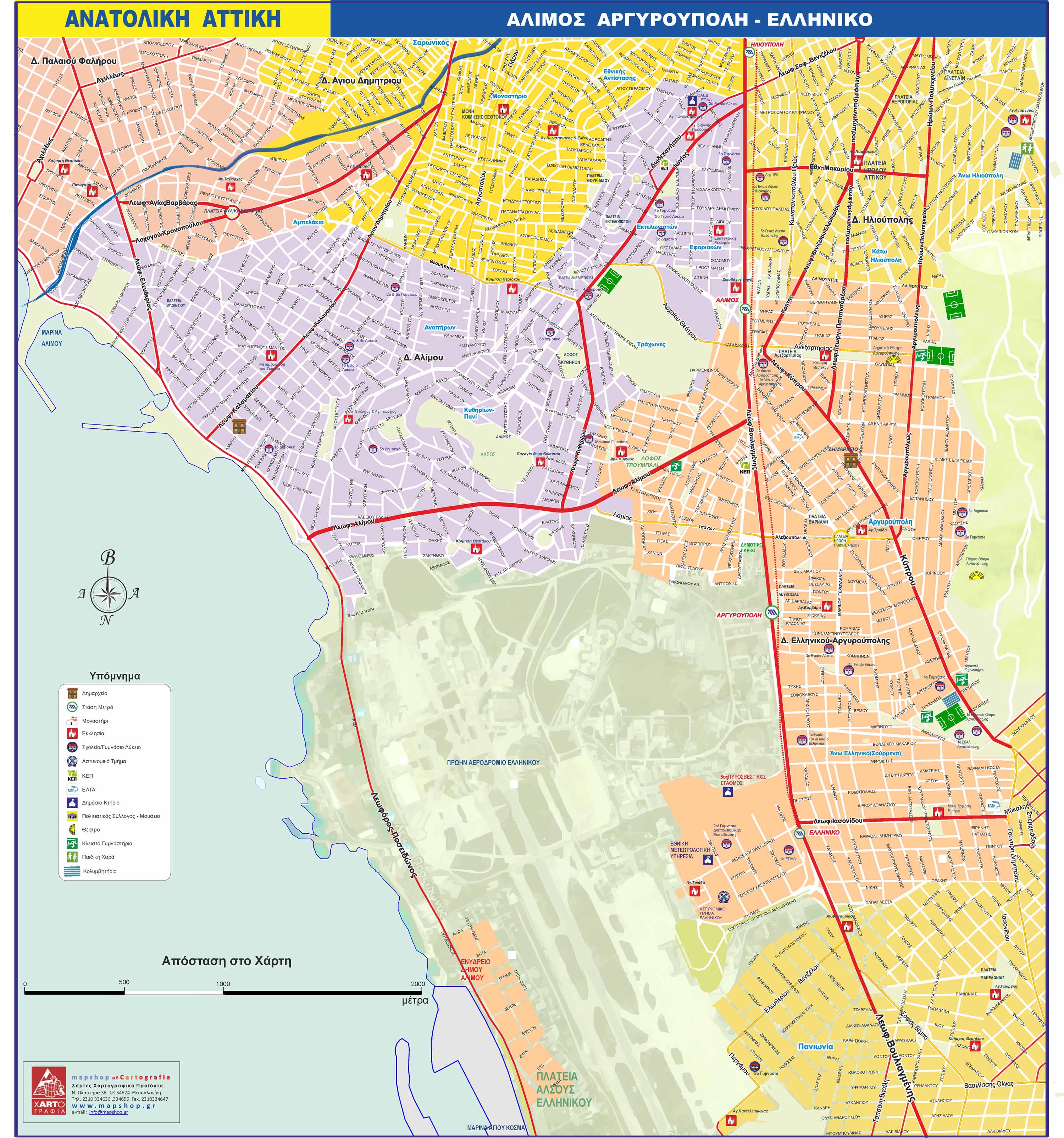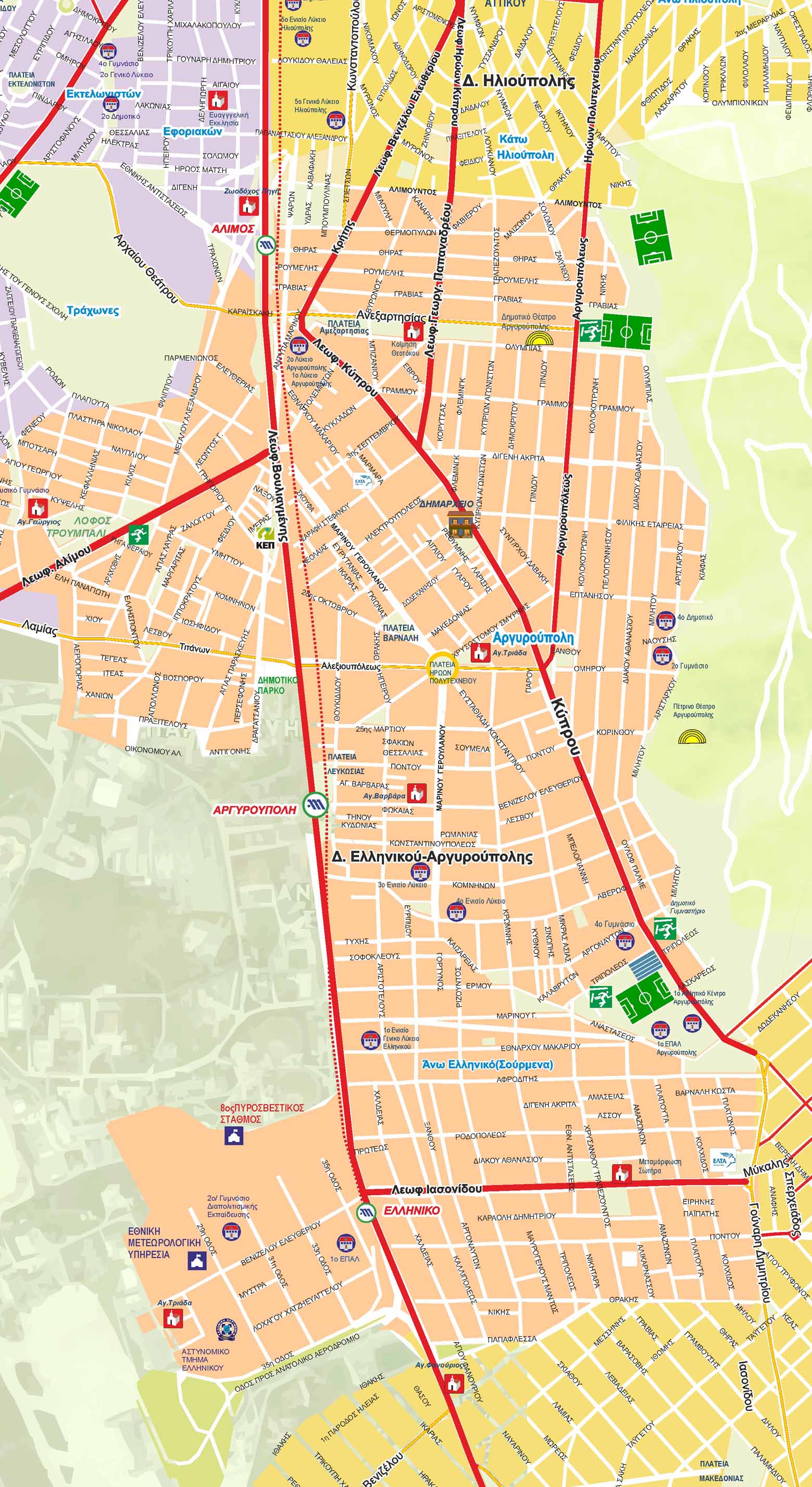 Χάρτης της Ανατολικής Αττικής με τους δήμους Αλίμου, Ελληνικού και Αργυρούπολης με τις κυριότερες λειτουργίες.