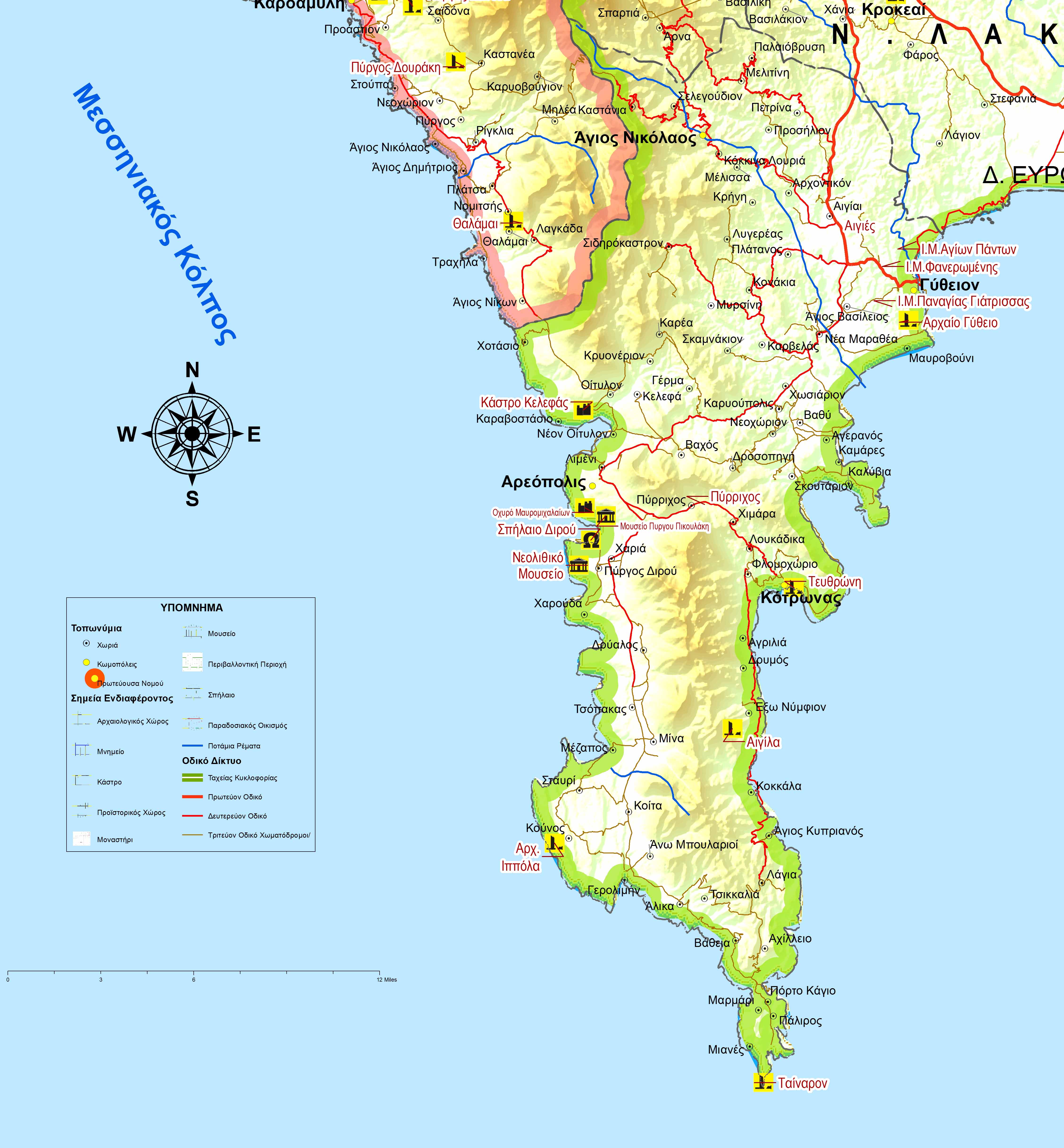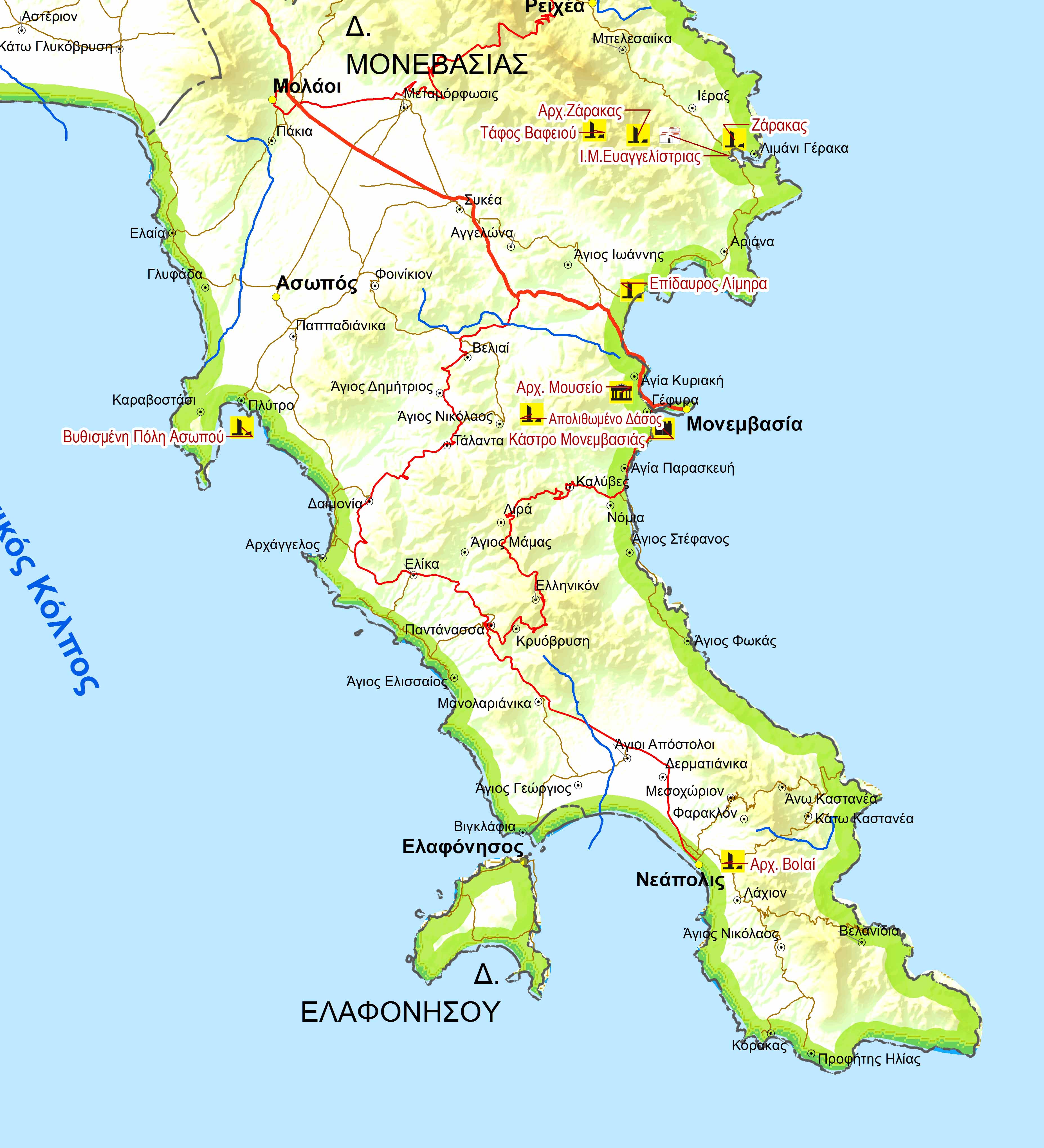 Χάρτης Νομού Λακωνίας με τα κύρια σημεία ενδιαφέροντος.