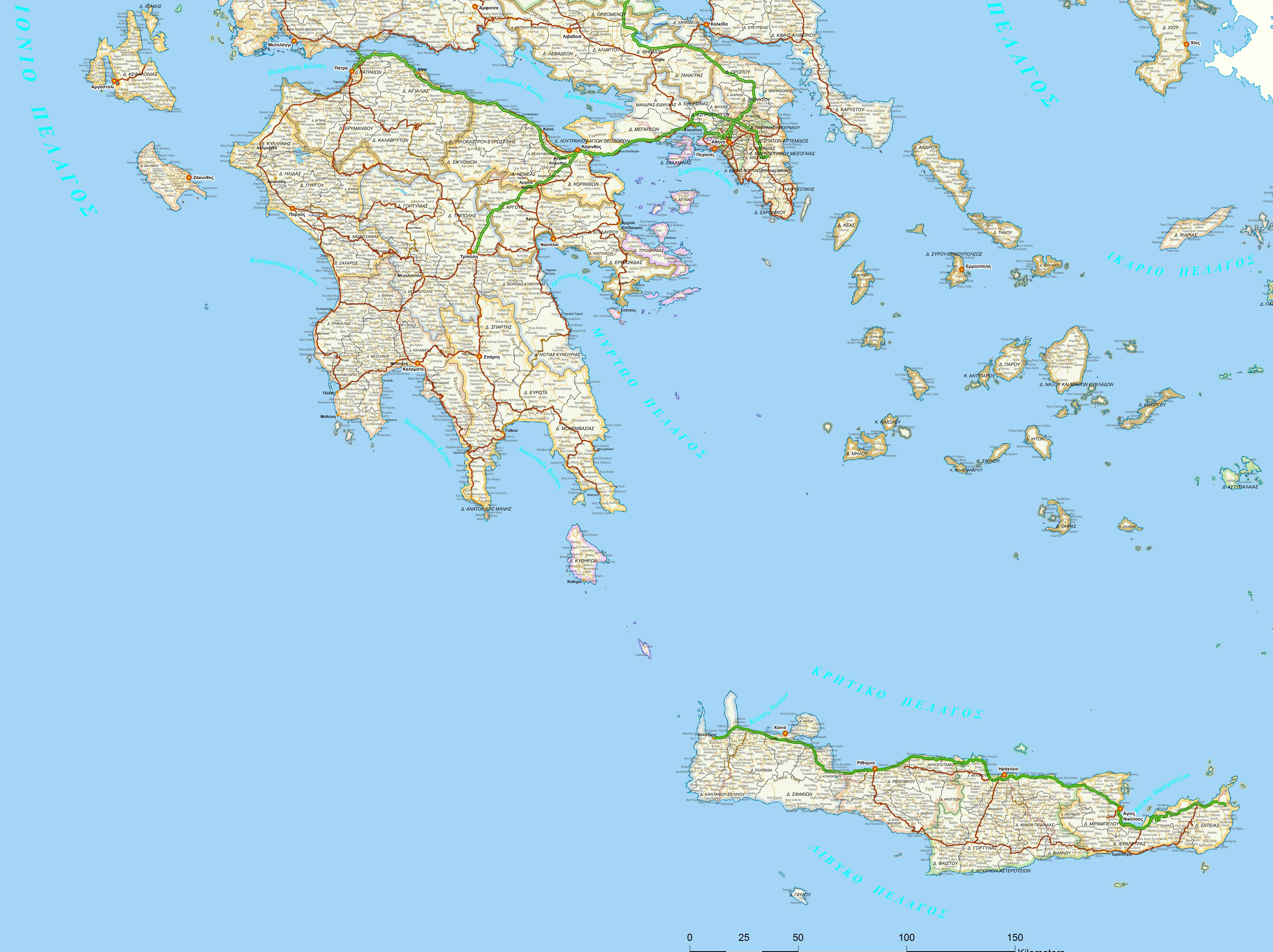 Πολιτικός χάρτης της Ελλάδας με τις βασικότερες πόλεις και τα κυριότερα σημεία ενδιαφέροντος.