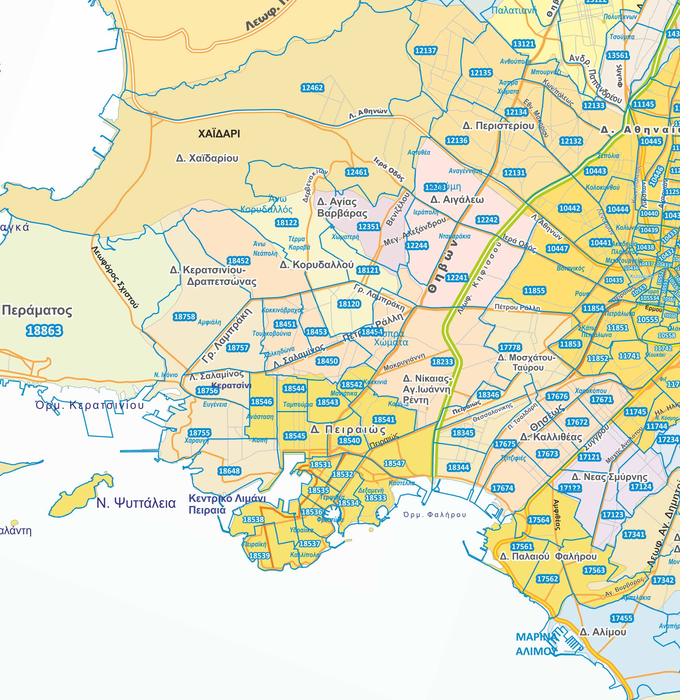 Χάρτης Περιφέρειας Αττικής με τους Ταχυδρομικούς Κώδικες ανά περιοχή.