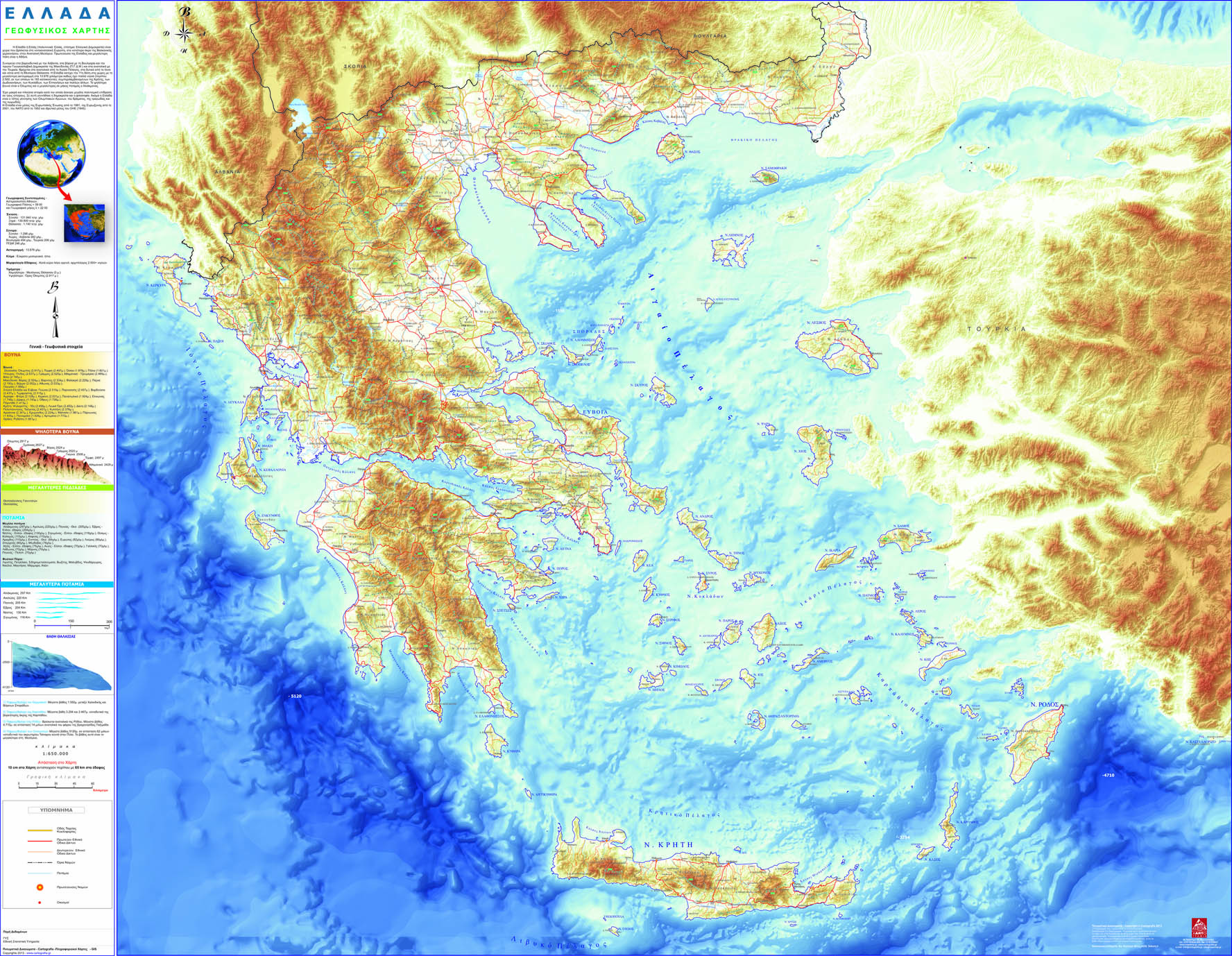 Ο νέος Γεωφυσικός χάρτης που περιλαμβάνει το ανάγλυφο της Ελλάδας με την πιο μοντέρνα απεικόνιση, είναι κατάλληλος για Σχολεία, Γραφεία κυνηγούς, ορειβατες κ.λπ. Περιέχει όλα το ανάγλυφο του Ελλαδικού χώρου με τα βουνά ονομαστικά αλλά και το ανάγλυφο του βυθού.Επίσης κείμενο με τα βασικά χαρακτηριστικά της γεωμορφολογίας της Ελλάδας.