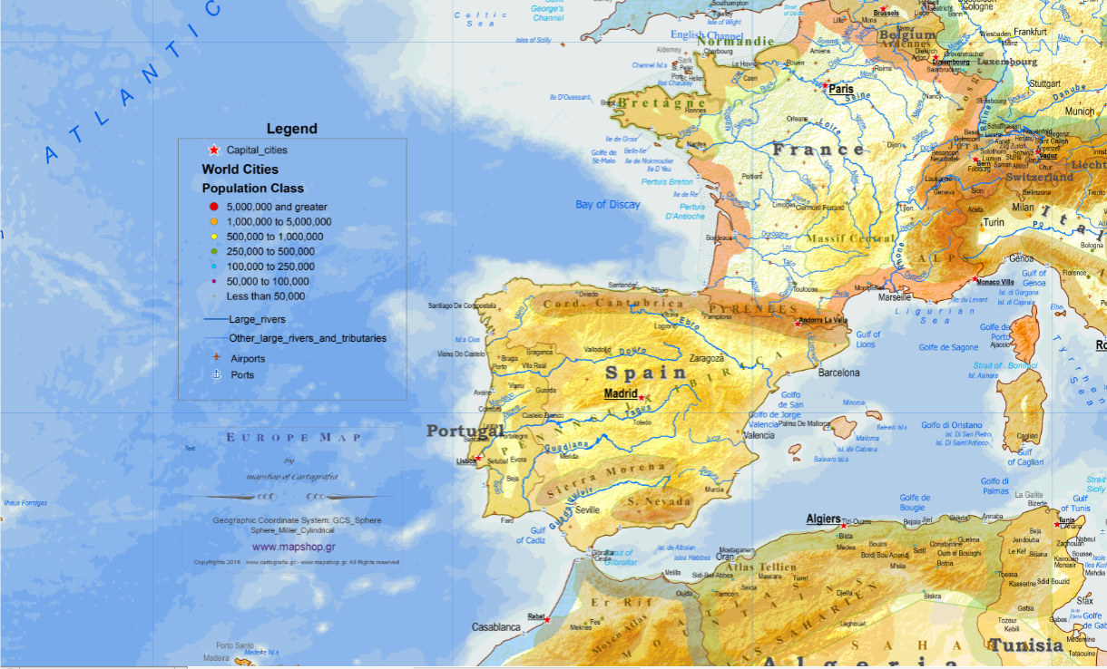 Ενας νέος Χάρτης Ευρώπης με στοιχεία και Γεωφυσικά (Οροσειρές, Οροπέδια. Πεδιάδες, Ποτάμια , Λιμνες κλπ) και Πολιτικά όπως τις μεγάλες Πόλεις της Ευρώπης άνω των 100000 κατοικων, Κράτη με συνορα χρωματικά διαχωρισμένα κ.λπ. Κατάλληλος για παιδικό δωμάτιο, για Σχολεία και για διακοσμηση