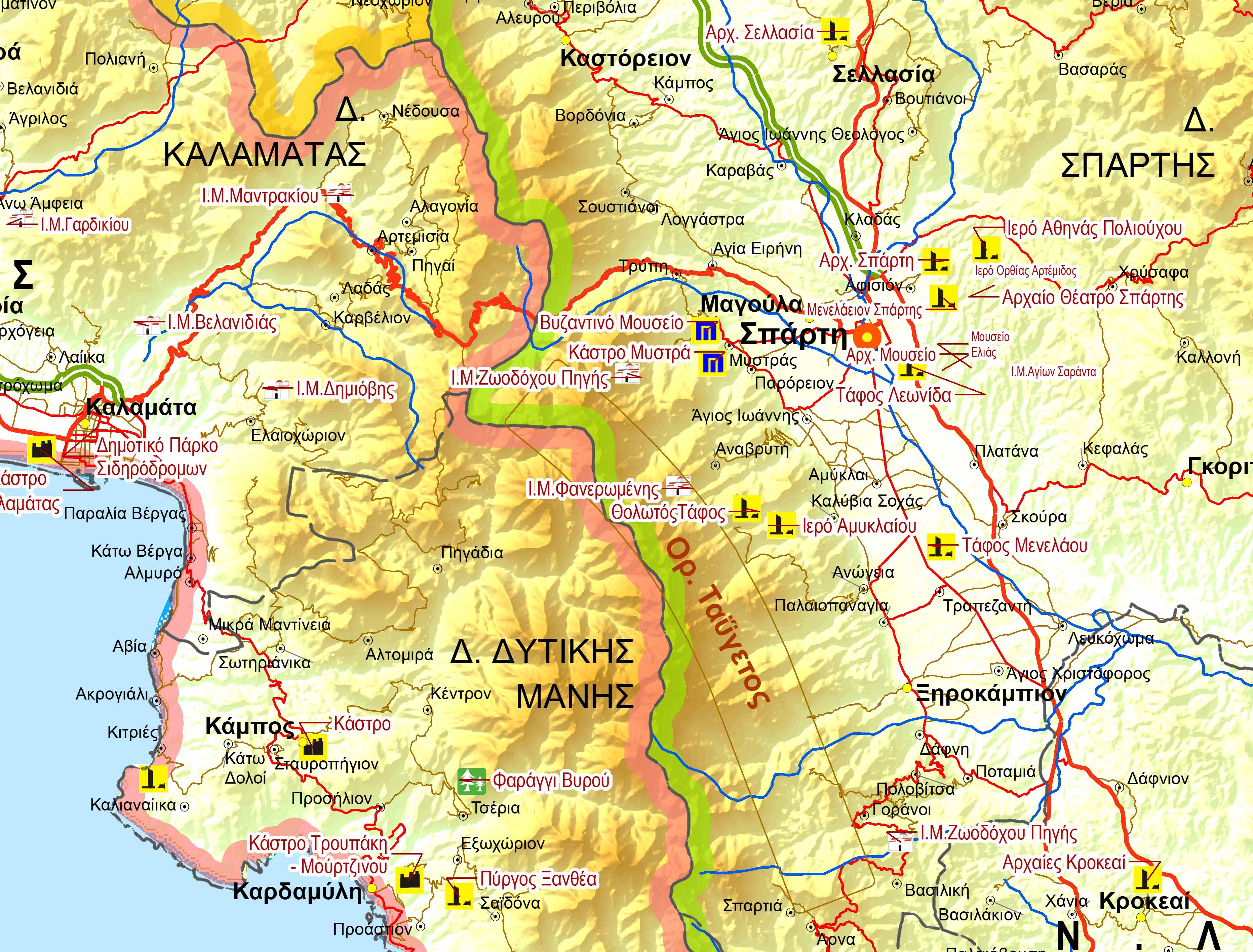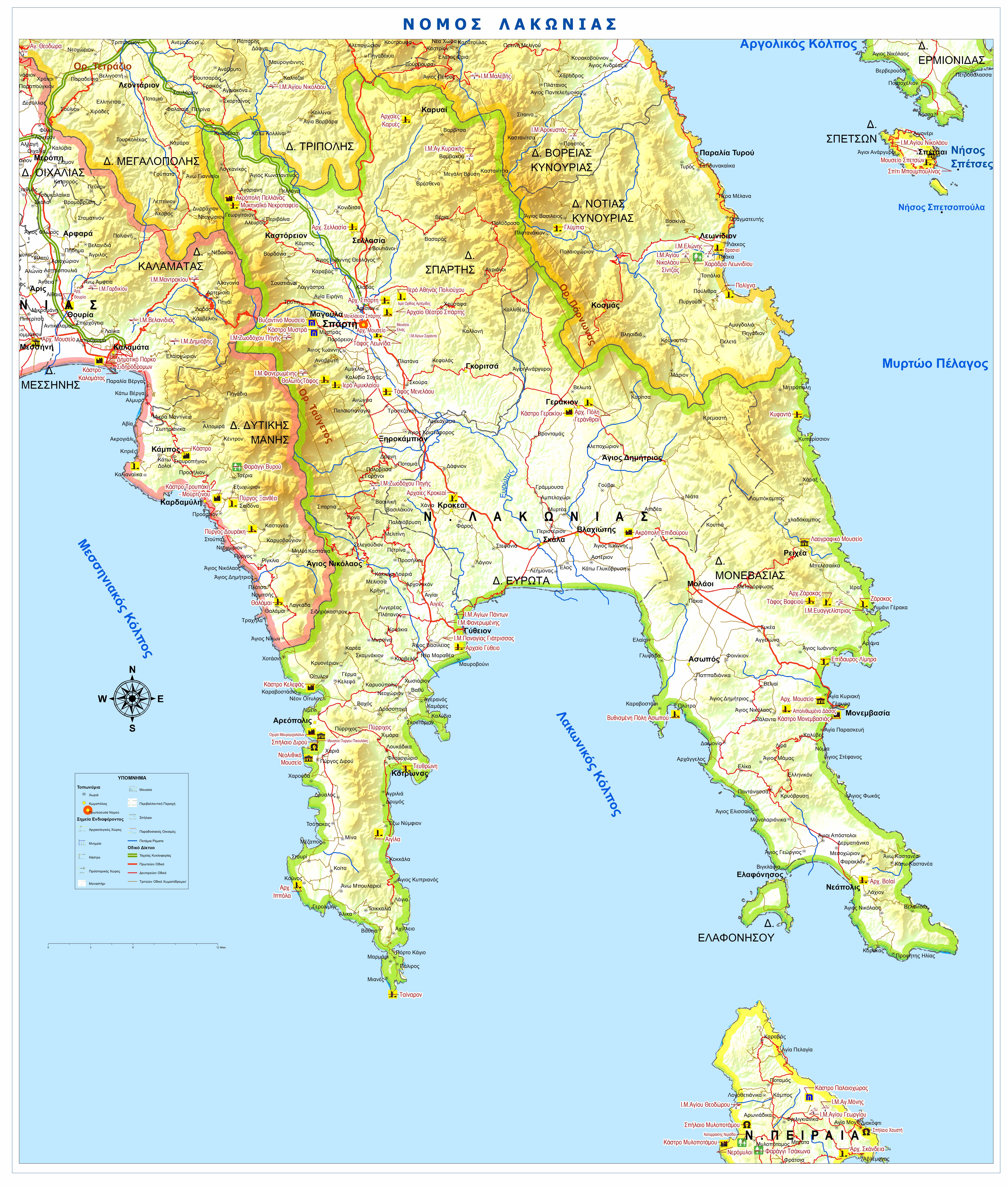 Χάρτης Νομού Λακωνίας με τα κύρια σημεία ενδιαφέροντος.