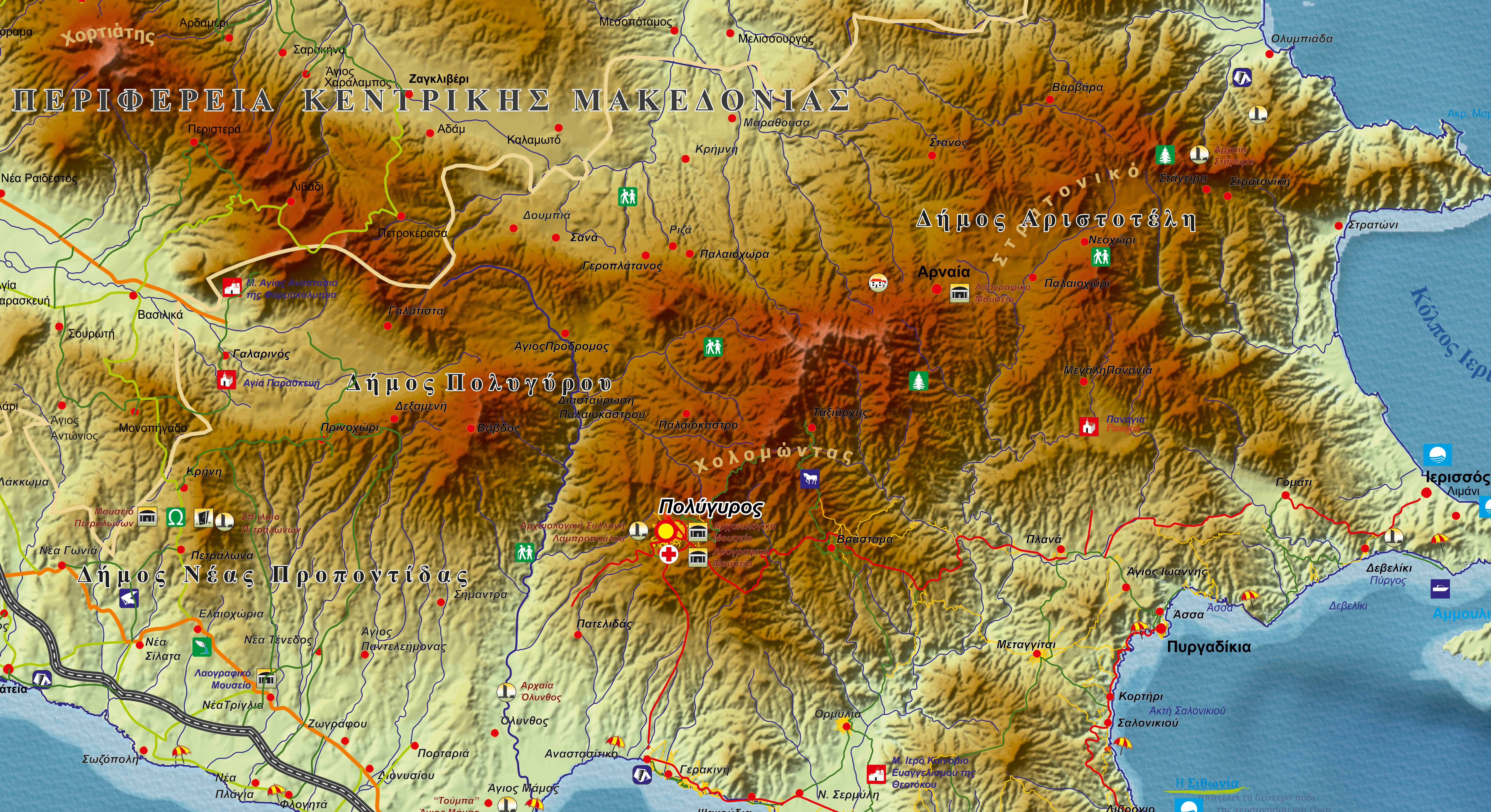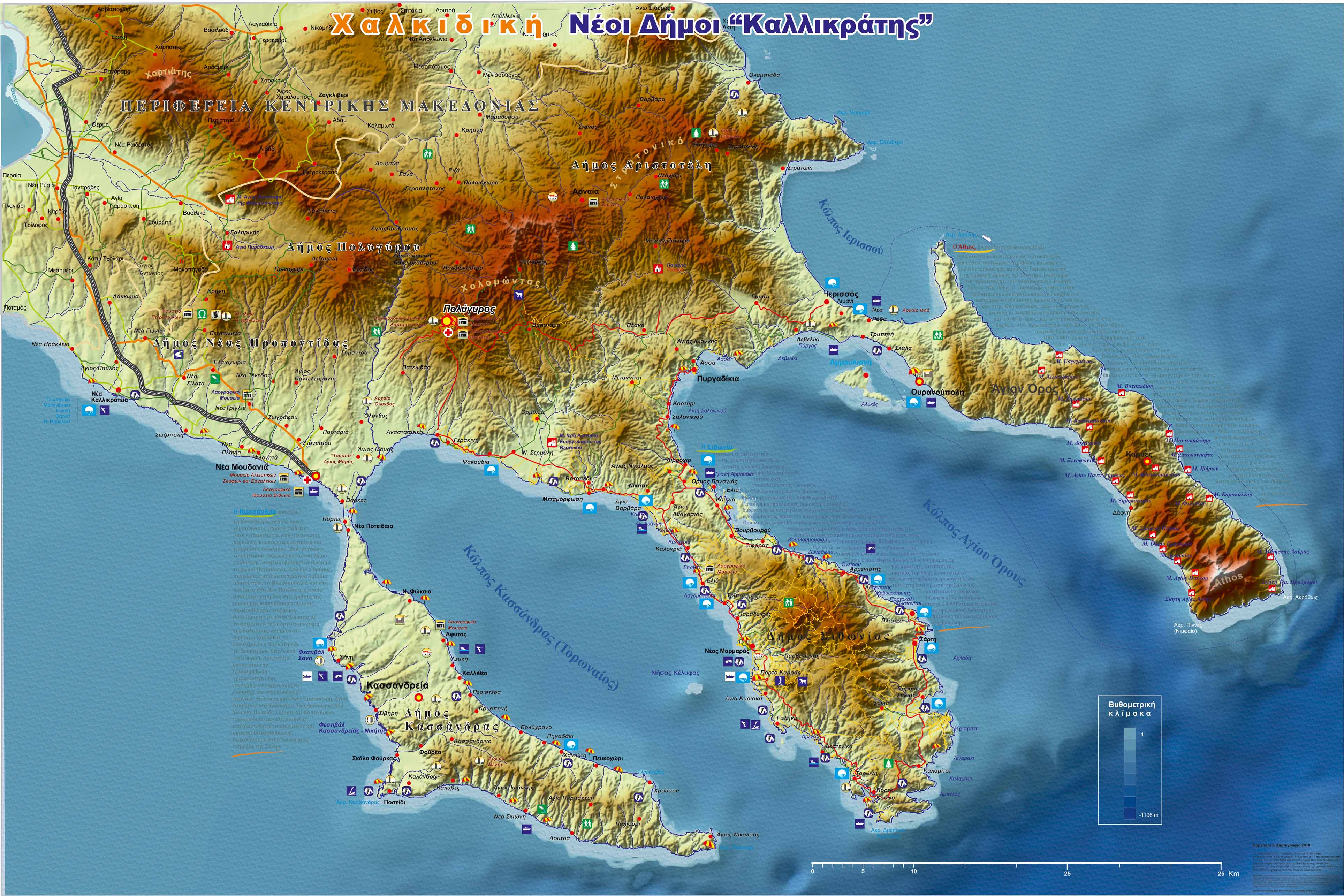 Χάρτης Χαλκιδικής Νέοι Δήμοι "Καλλικράτης" με τα κυριότερα σημεία ενδιαφέροντος.
